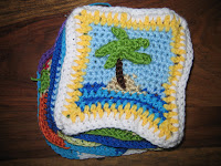 For my friends Bob and Stephanie's baby, due in February. The hat was made on a small circle loom with a flower on top. The center of the blanket was made on a circle loom. The border is made of two rounds of double crochet stitches, one round of V double crochet stitches, one round of single crochet then chain three stitches, and one round of four double crochet with chain three in between per loop. The pattern in the center was done with single crochets in an argyle pattern.